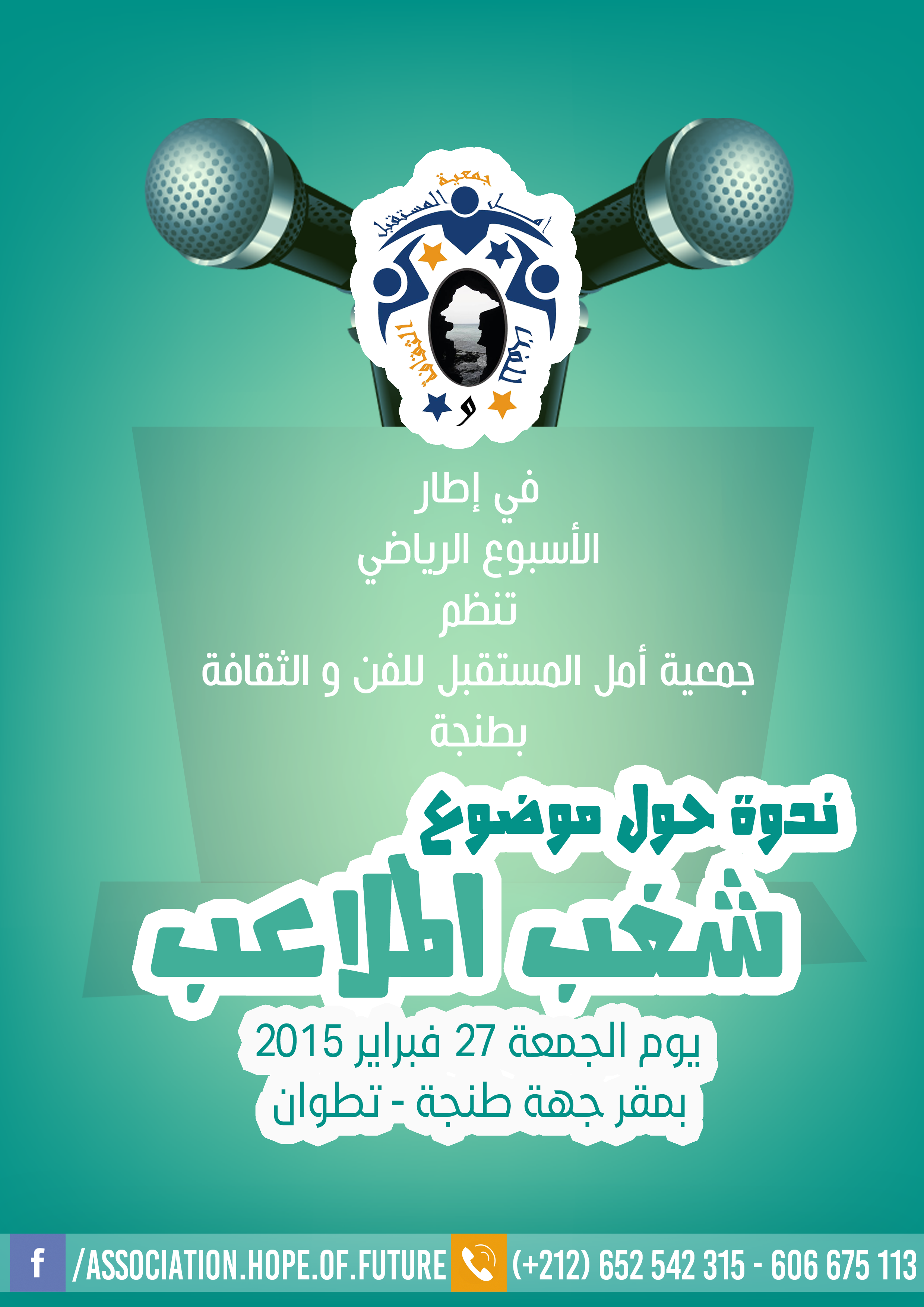 في إطار أنشطتها الرياضية ، تنظم جمعية أمل المستقبل للفن والثقافة أسبوعها الرياضي أيام : 27 و28 فبراير 2015 و1-2 مارس 2015. يتضمن الأسبوع : ندوة حول شغب الملاعب ، تقام بمقر جهة طنجة / تطوان ، بالإضافة إلى دوري في كرة القدم ذكور وإناث ، ودوري في كرة السلة إناث ، بمقر الثانوية التأهيلية الإمام الغزالي .